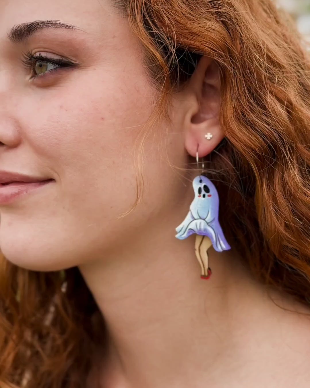 Pendientes de edición limita con diseño de fantasma inspirados en Marilyn Monroe, elaborados en madera de tilo y pintados a mano con pintura acrílica.